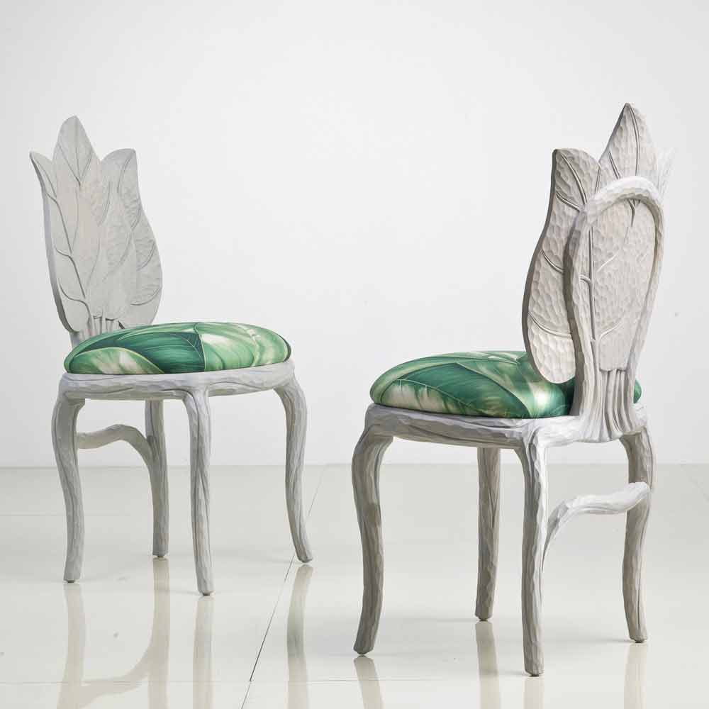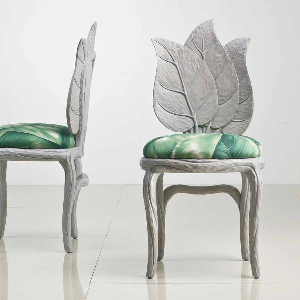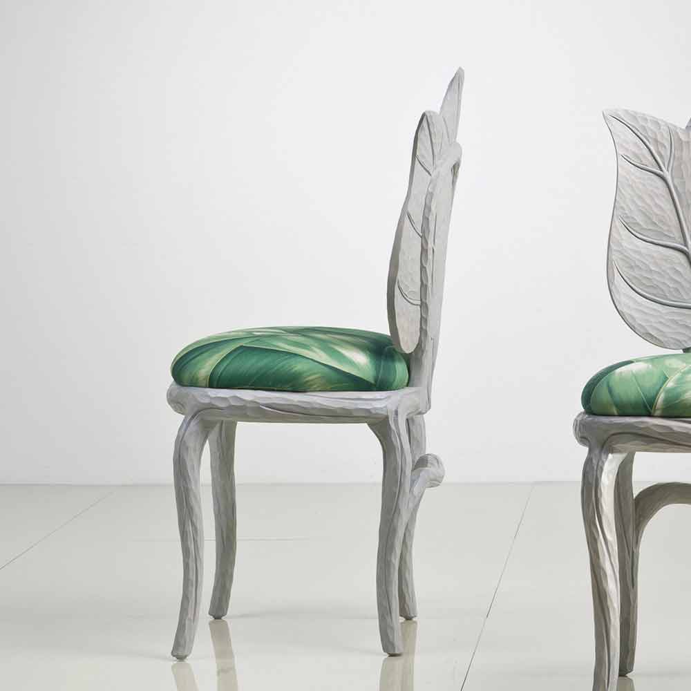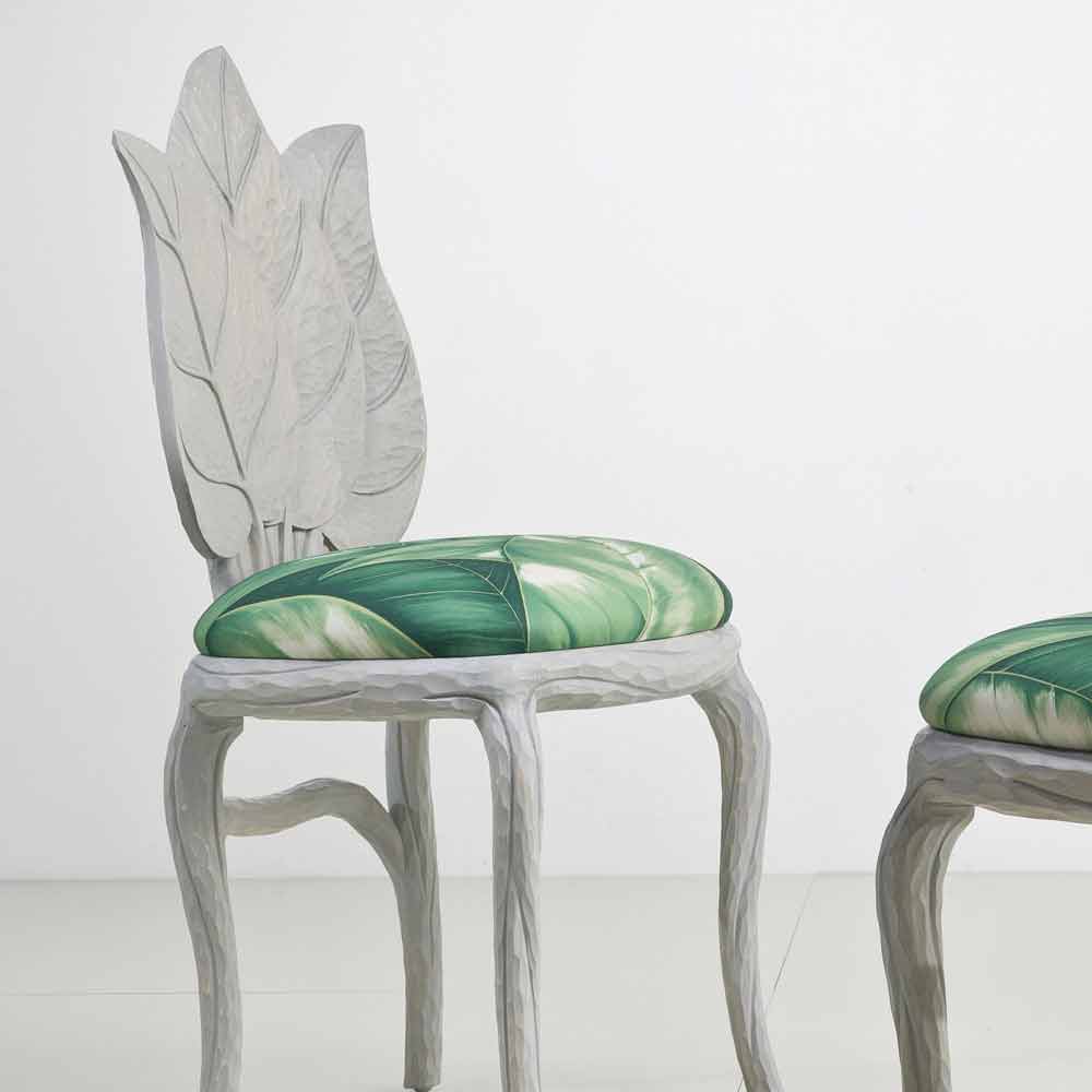 Jídelní židle s opěradlem ze 3 listů vyřezávané, čalouněným sedákem s nehořlavou pryž. Pevný struktura dřeva reprodukuje formy banda listů vyřezávaných ve dřevě a jejichž ramena jsou innervated tenkých větvích, z téhož důvodu, který se vyjme do krycí textilie sedadla, ve směsi čerstvých listů a energetických odstíny. kouř šedý povrch.
