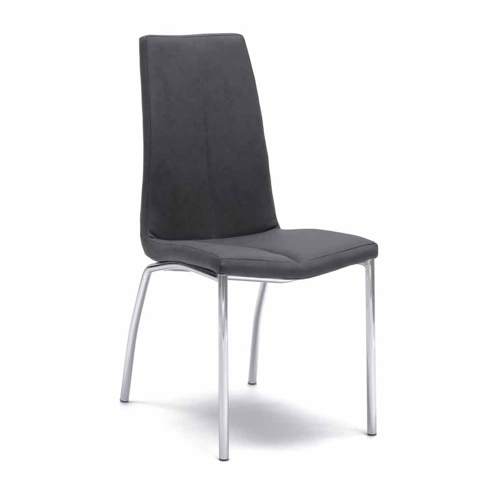 Židle s pochromovanou kovovou základnou. Sedák a opěradlo čalouněné polstrovanou imitací kůže. Dostupné v různých barvách: z rozevírací nabídky vyberte požadovaný povrch.