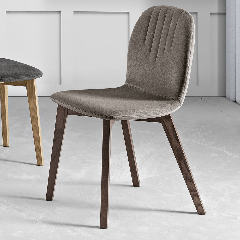 Tato židle elegantně kombinuje tón dřeva svých nohou s barvou látkového sedáku. Moderní, aerodynamický design opěradla, zdobený jemným lineárním vzorem , dodává nádech třídy, který okamžitě pozvedne každý jídelní stůl nebo pracovní prostor.