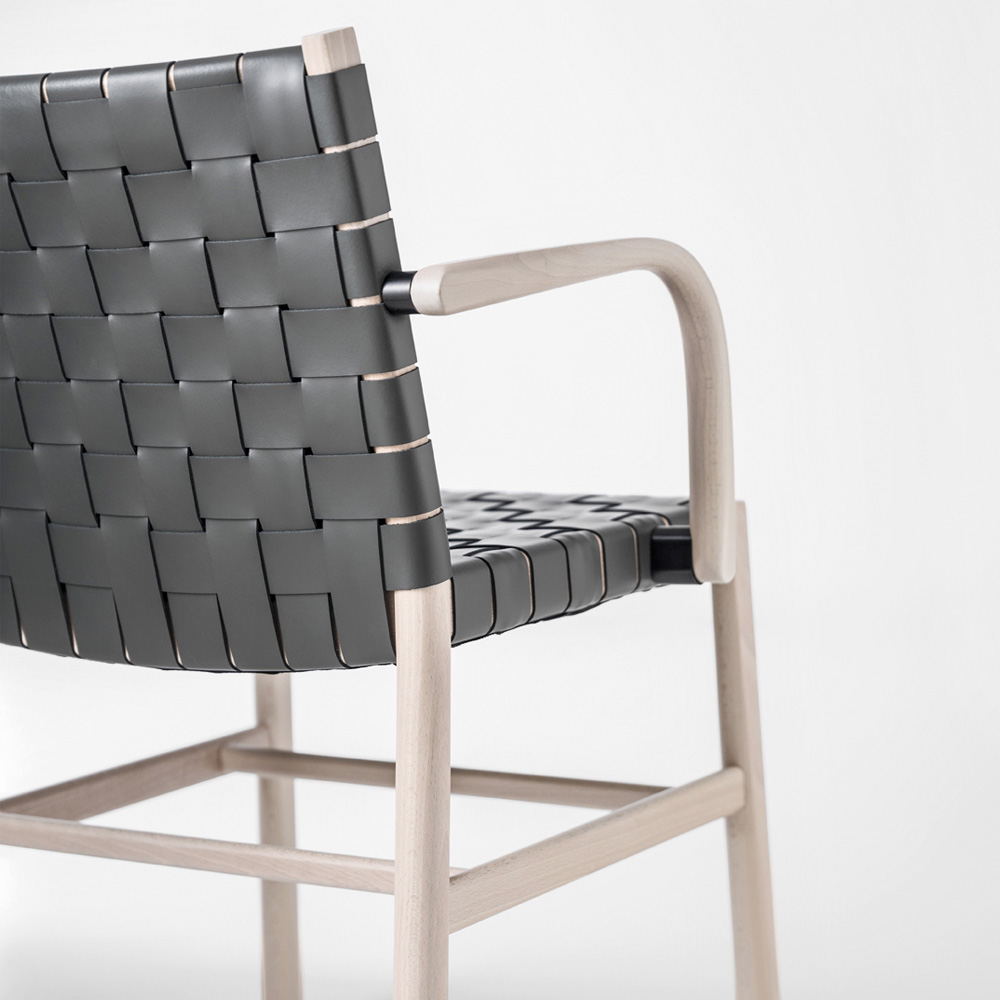 Moderní židle s područkami vyrobené v Itálii se strukturou z běleného bukového dřeva a opěradlem a sedákem z tkané kůže . Tradice a moderna se setkávají a spojují, aby vytvořily tento inovativní designový objekt s elegantním vkusem, který dokáže originálním a kreativním způsobem charakterizovat každé prostředí. Díky zvláštní vazbě z kůže, která pokrývá židli, je tato kresba nesmírně fascinující , ideální pro obohacení a přizpůsobení vašich prostor charakterem. Díky široké škále dostupných barev je možné si vybrat mezi střízlivým a diskrétním vzhledem nebo barevnějším a extravagantnějším řešením, čímž se podaří uspokojit všechny potřeby a zároveň vytvořit úžasnou harmonii s okolním nábytkem.