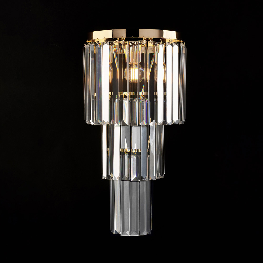 Toto elegantní a dramatické luxusní nástěnné svítidlo ze železa a pozlacené mosazi s kamínky je rafinovaným osvětlovacím prvkem určeným k oživení stěn teplým, obklopujícím světlem. Vertikální struktura, rozložená do několika úrovní, je zdobena průhlednými kamínkovými prvky , které vytvářejí sofistikovanou hru odrazů a dodávají prostoru hloubku a charakter.