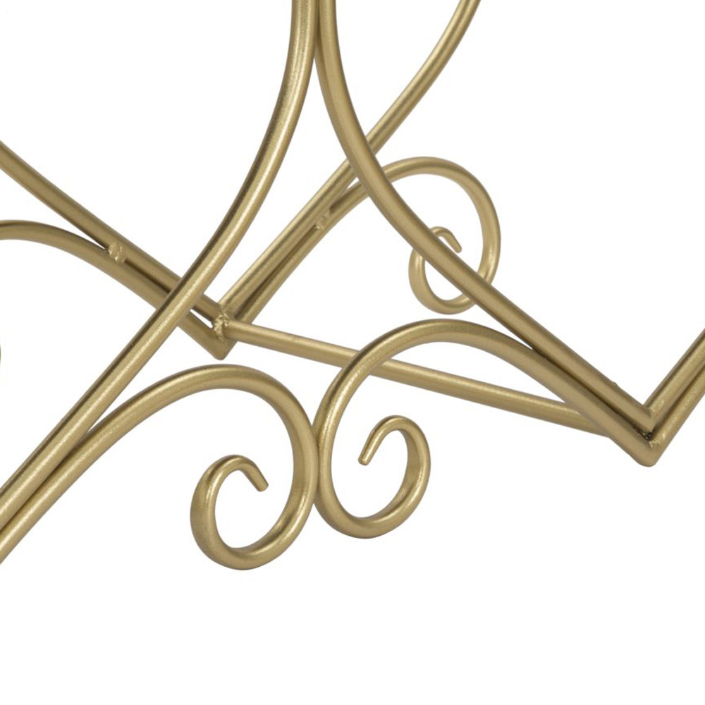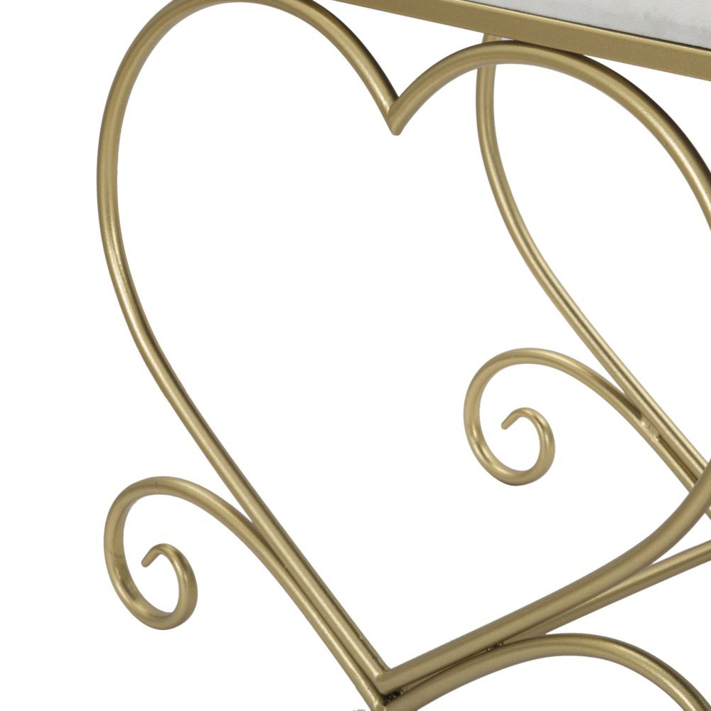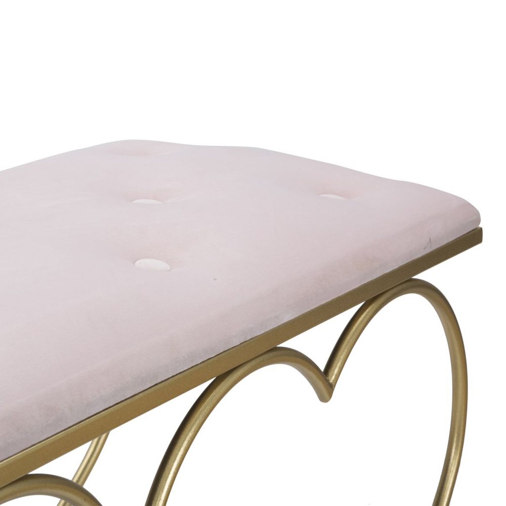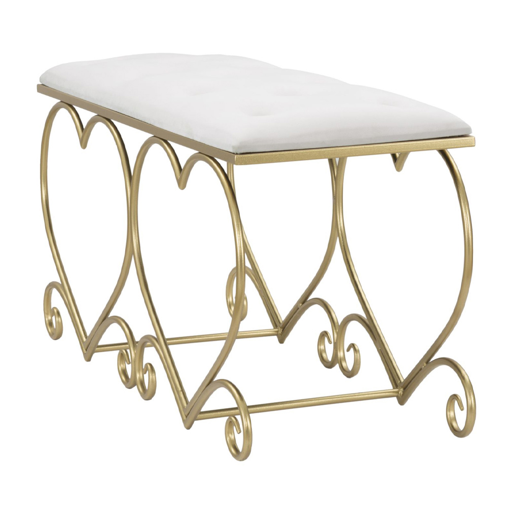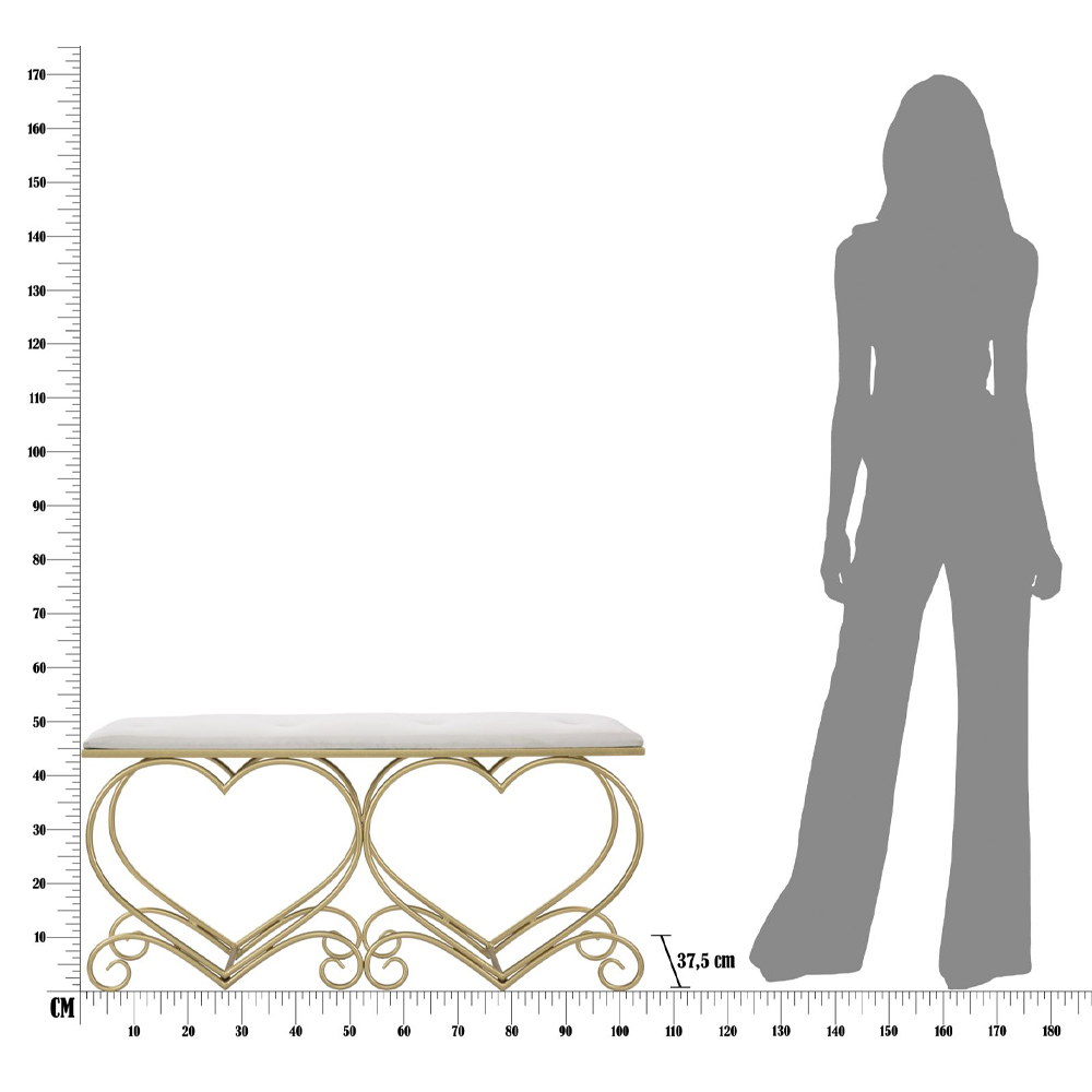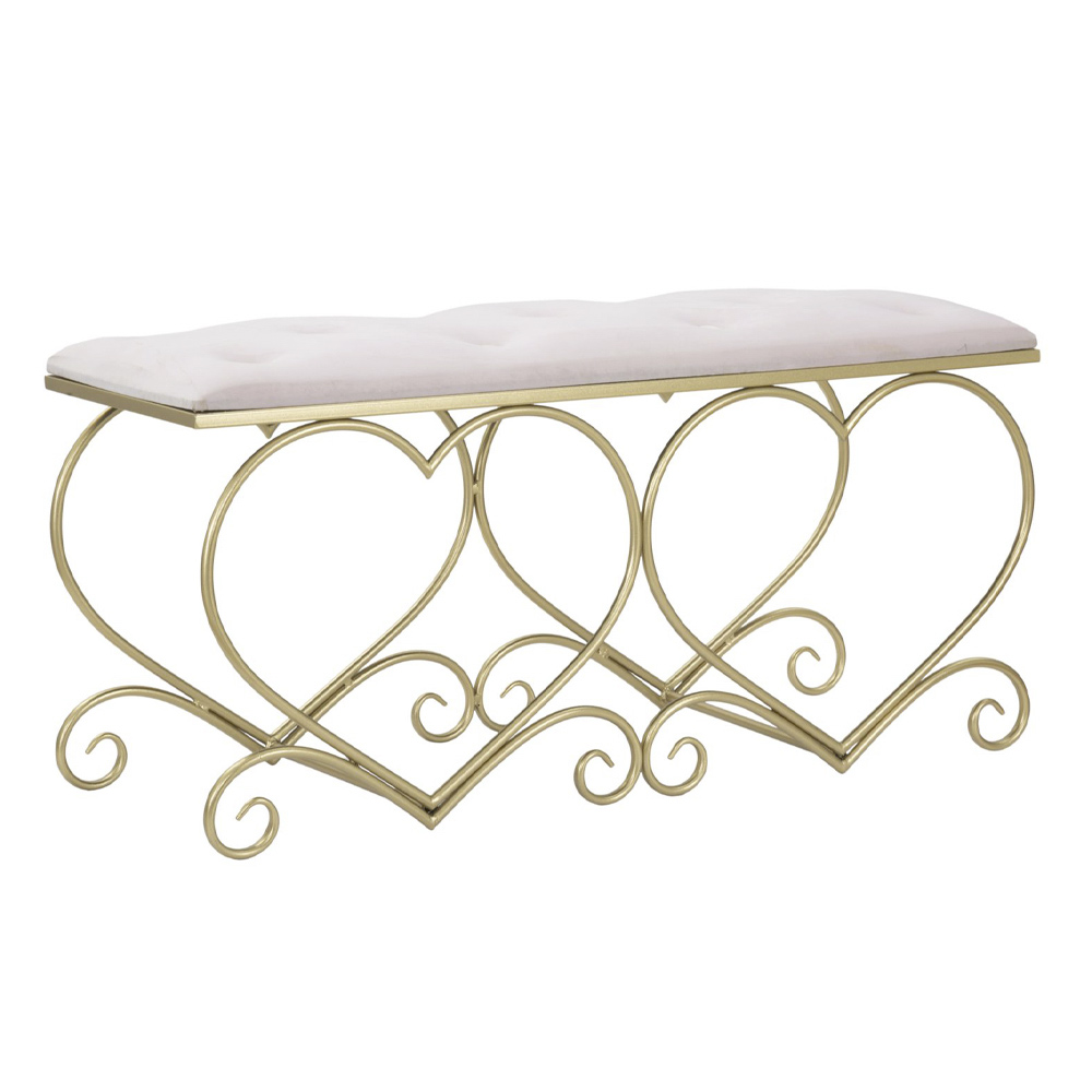 Moderní lavice se železnou strukturou ve zlaté povrchové úpravě a látkovým sedákem.