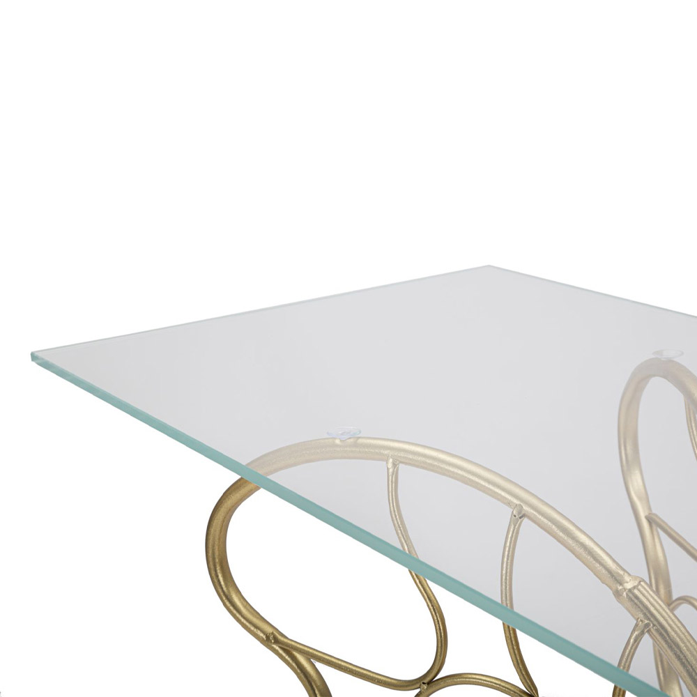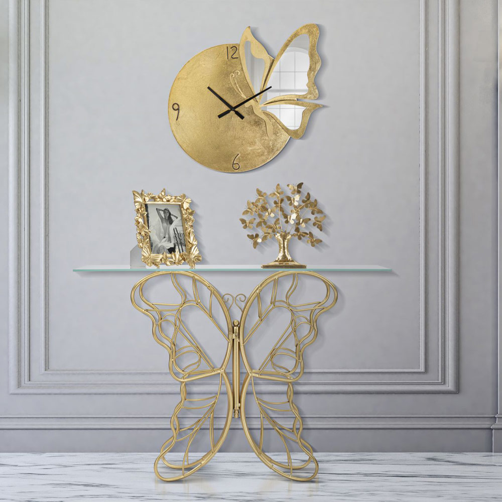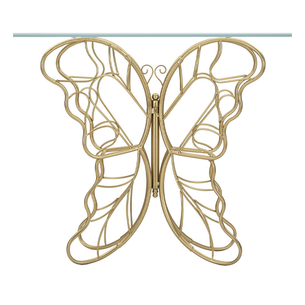 Moderní pevná konzola se zlatou povrchovou úpravou a průhlednou skleněnou deskou . Estetika a funkčnost se spojily, aby oživily originální zařizovací doplněk s romantickou duší charakterizovanou zvláštní konformací základny, která obnovuje elegantní tvar motýla, a tím obohacuje konečný design výrobku. Dokonalá kombinace zlaté povrchové úpravy základny a sofistikovaného dotyku skleněné desky dělá z této konzoly ideální dekorativní prvek pro ty, kteří hledají kreativní styl a kteří rádi vybavují své domácí prostory předměty se silnou vytříbenou osobností .