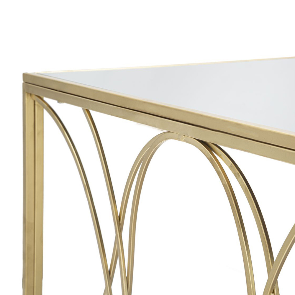 Konferenční stolek se zlatou povrchovou úpravou a zrcadlovou deskou . Jednoduchý a podmanivý design je jedinečný a exkluzivní díky konkrétní základně, která využívá křivolaké linie a geometrické tvary k obohacení estetiky výrobku, která dodává nádech osobnosti . Výsledkem je rafinovaný a avantgardní konferenční stolek, který se díky své univerzálnosti a současnému charakteru dokáže přizpůsobit jakékoli moderní stylistické situaci.