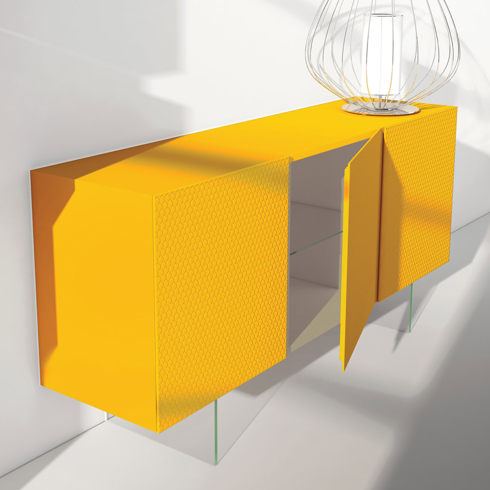 Příborník do obývacího pokoje s kanárkově žlutou matně lakovanou MDF konstrukcí také včetně extra čirých skleněných nožiček . Systém otevírání má 3 výklopné dveře pro zajištění dokonalé funkčnosti a praktičnosti . Tento výrobek se vyznačuje vkusem a designem díky spojení různých materiálů, jeho elegantní a rafinované povrchové úpravě a ozdobený ozdobou na dvířkách tvořenou mnoha malými HPL voštinovými dlaždicemi . Všechny materiály použité na konstrukci nabízejí vysokou kvalitu a odolnost v průběhu času, což produktu dodává jedinečný a nezapomenutelný nádech.