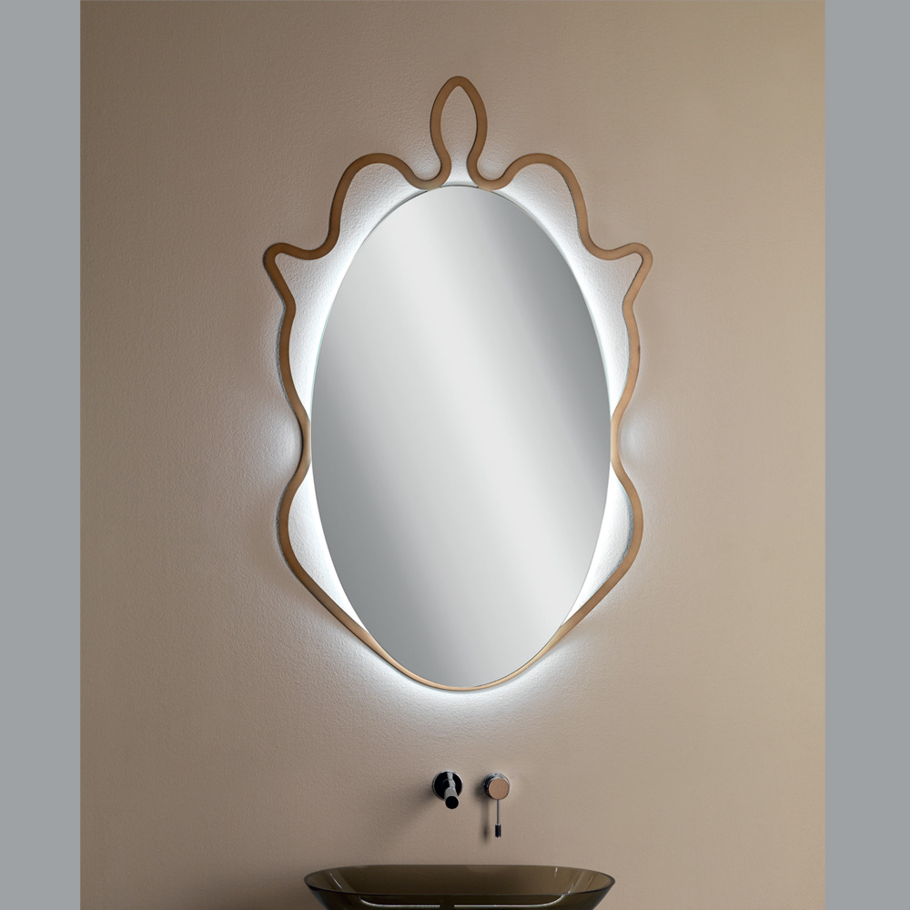 Toto italské řemeslné zrcadlo je kvintesencí funkční elegance , poctou mistrovství v designu, který svou přítomností vylepší každý prostor. Jeho klikatý a organický profil, který odráží měkké tvary přírody, je orámován rafinovaným obrysem z drahého kovu , který jej proměňuje ve skutečné umělecké dílo.