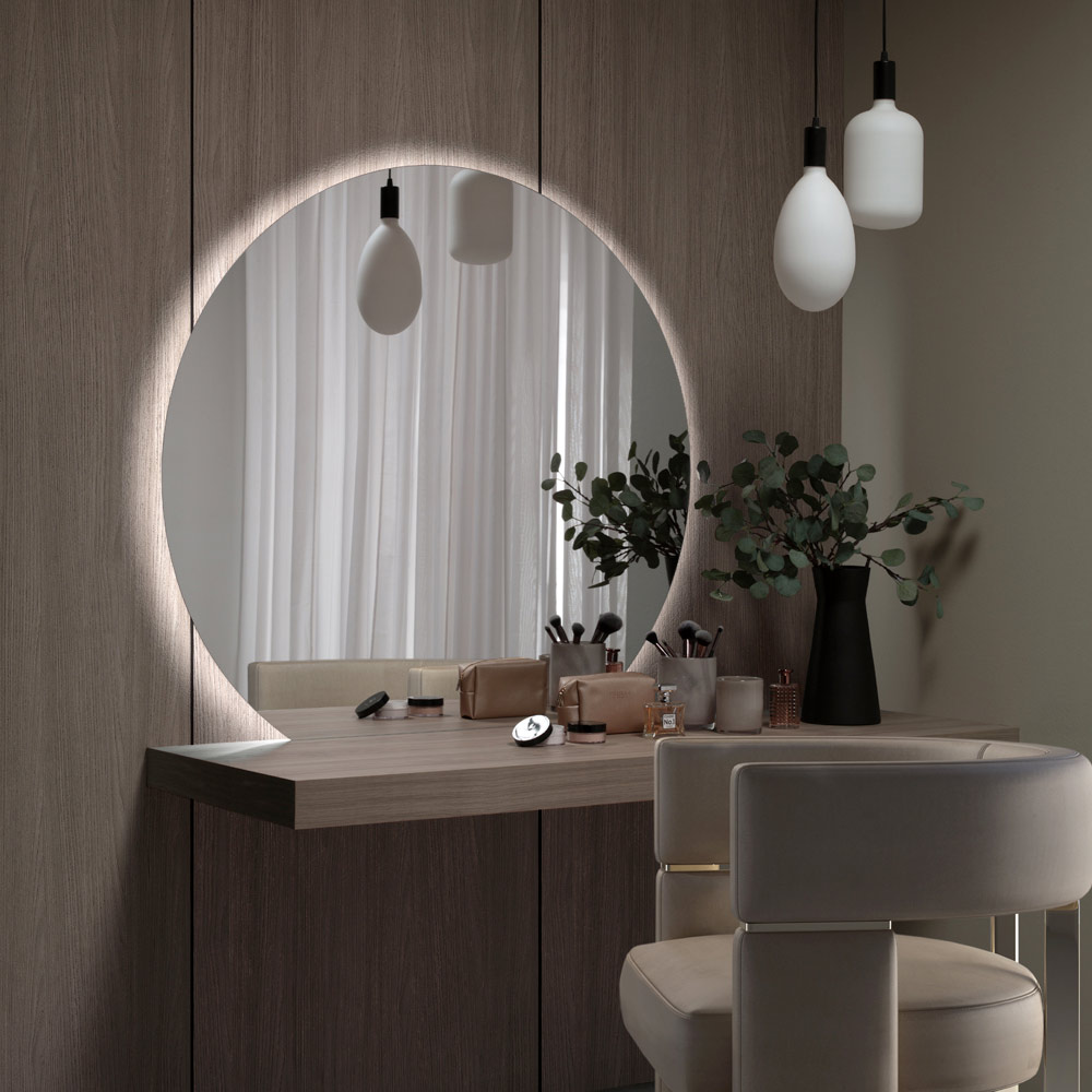 Toto kruhové zrcadlo je mistrovským designovým dílem, které ztělesňuje eleganci a modernost. Podsvícení , které sleduje jeho profil, poskytuje éterickou záři a měkké světlo, které vylepšuje každé prostředí a vytváří intimní a rafinovanou atmosféru. Kulatý tvar zrcadla, nadčasová volba stylu, odráží a umocňuje přirozené světlo a krásu okolního prostoru. Toto podsvícené zrcadlo, ideální do vchodu, koupelny nebo jako ústřední bod v obývacím pokoji, není jen reflexním prvkem, ale skutečným nábytkem, který spojuje tvar a funkci, krásu a jas, výsledkem je čistý styl a atmosféra. .