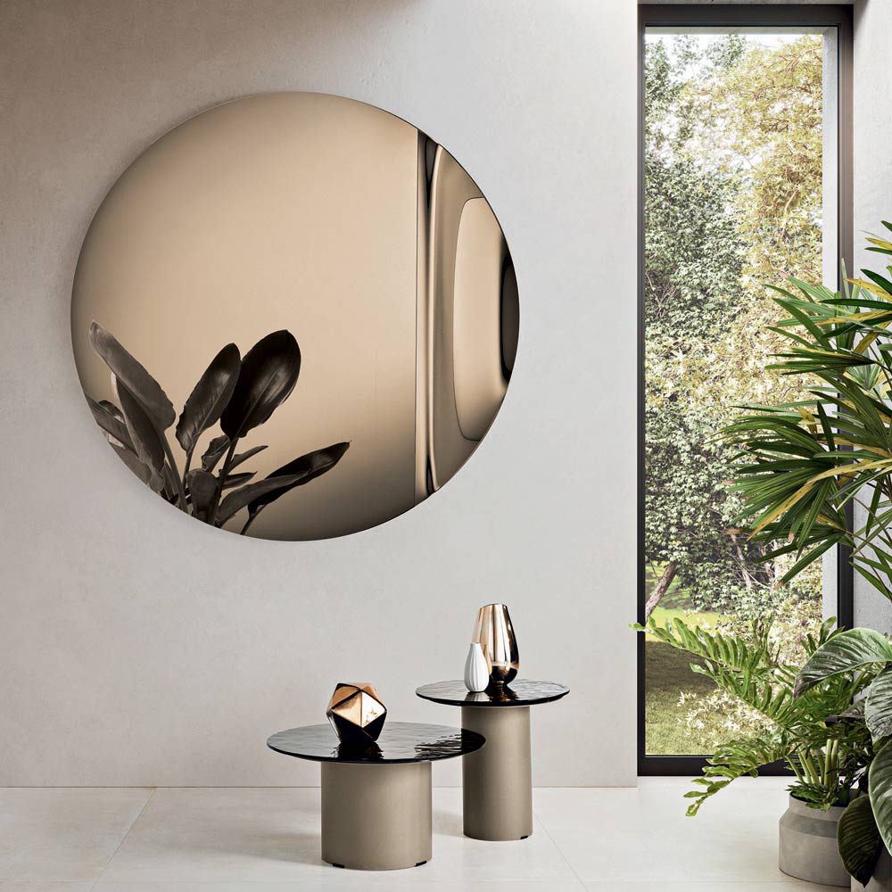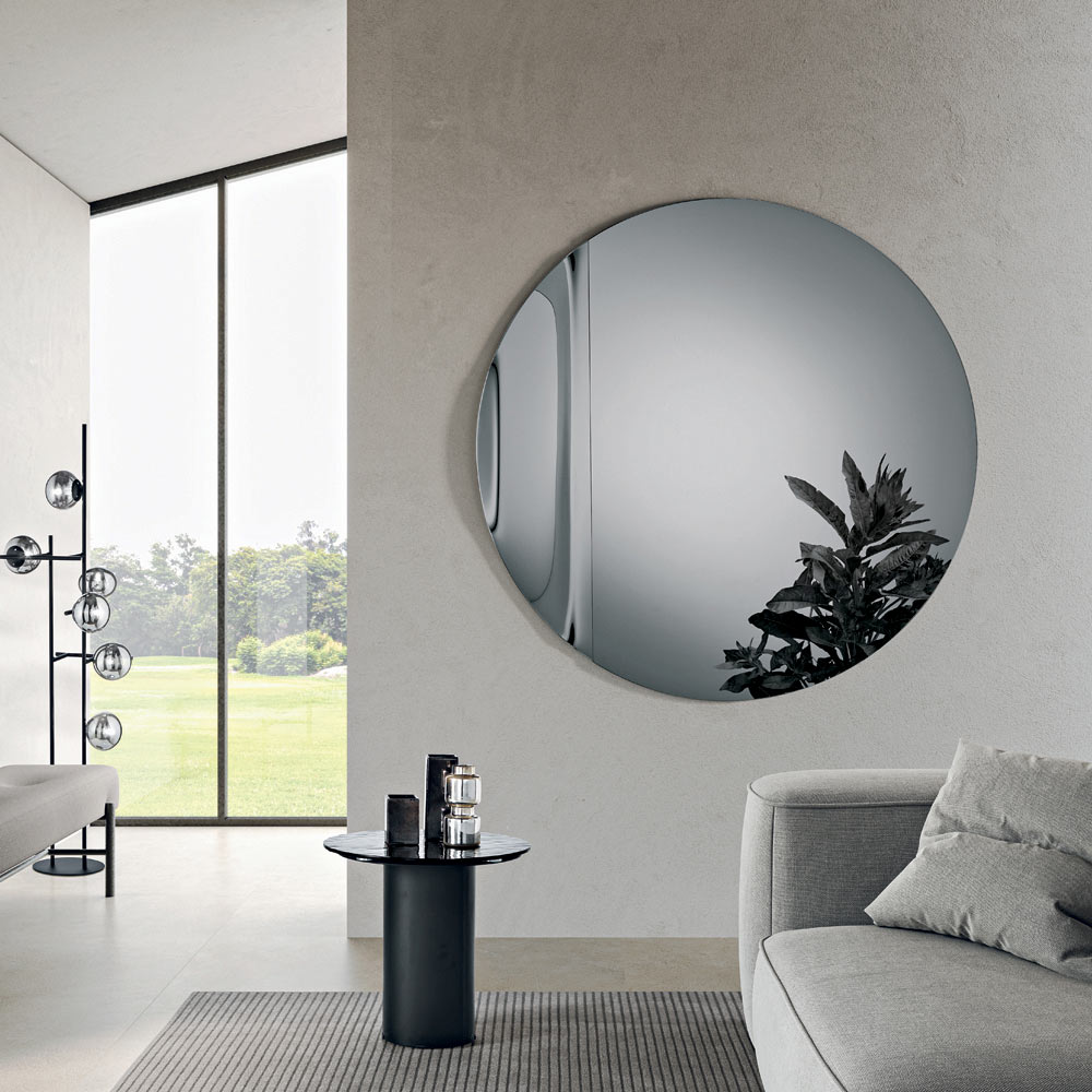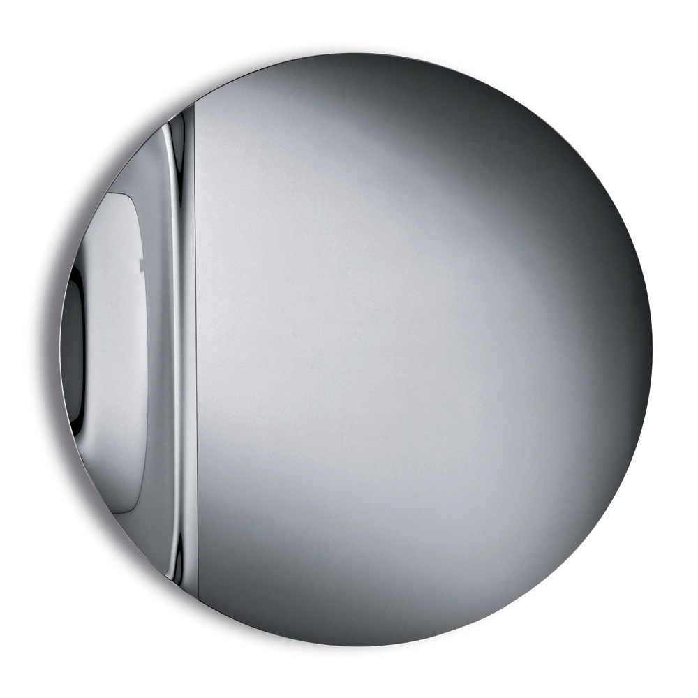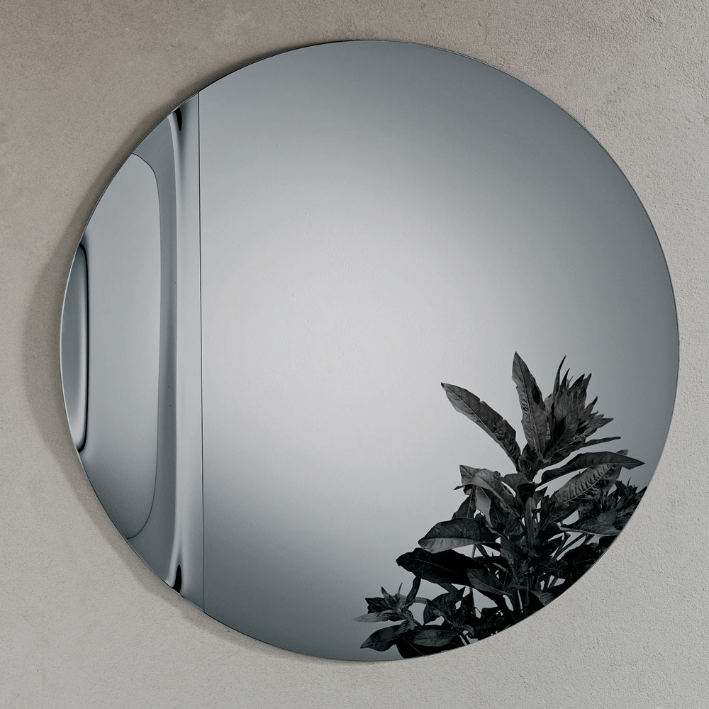 Zrcadlo má kulatý tvar vyrobený z litého skla , zdobený boční vlnou , která elegantně narušuje dokonalou symetrii kruhu. Tento jemný detail vytváří rafinovanou hru odrazů a dodává zrcadlu sochařský a zároveň lehký vzhled.