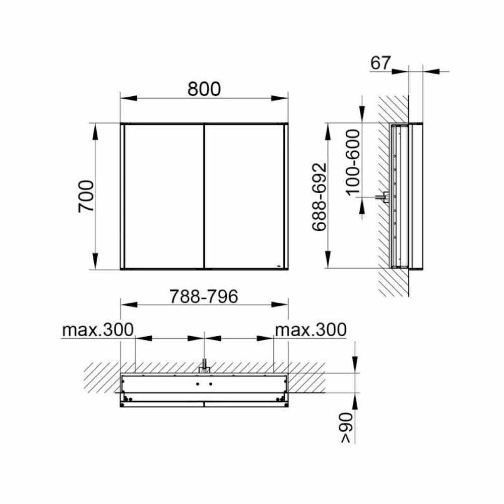 LED osvětlení, která je snadno nastavitelná a stmívatelná pomocí elektronického spínače snímače, čímž vytváří jedinečnou atmosféru v místnosti. Po otevření se 2 dveře otáčejí kolem světelných pásů, což umožňuje dosáhnout optimálního osvětlení jak při zavření, tak při otevření.
